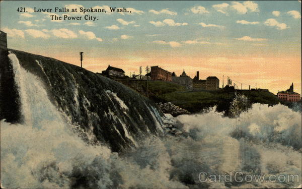 Front: 421. Lower Falls at Spokane, Wash., The Power City. Back: Re and Island Possessions Cuba, Canada and MESSAGE MAY BE WRITTEN ON THIS SIDE PUBLISHED BY THE BOUGHTON-ROBBINS CO., SPOKANE, WASH. MADE IN U. S, A. R-38350 50