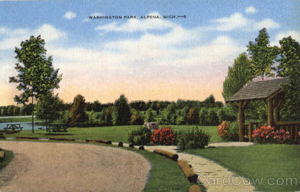Front: WASHINGTON PARK, ALPENA, MICH.6 Back: Со 50 10 Published by Alnena Candy & Cigar Co., Alpena, Mich. -A “Natural Color Card" by E. C. Kropp Co., Milwaukee, Wis.-DI- One of Alpena's recreational playgrounds.