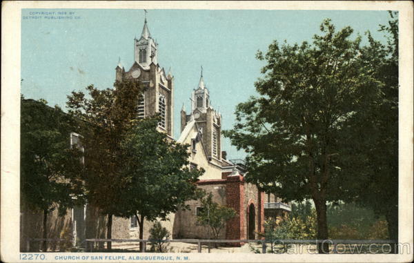 | The old church of San Felipe faces the plaza in "Old Town" at Albuquerque. It was founded several hundred years ago; services are still held there. Countless throngs have passed through its ever open doors. How much happiness and how much sorrow it knows, one can only guess |
