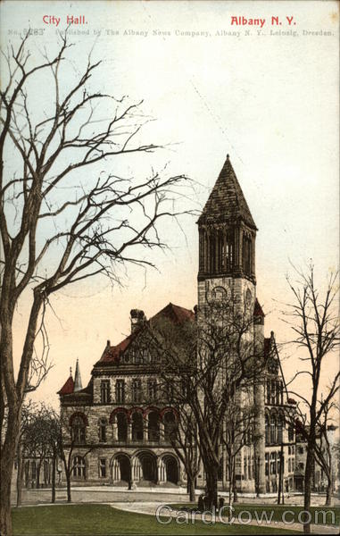 Front: City hHall. Albany N. Y. No, 5283 Ru plished by The Albany News Company, Albany N. Y., Leipzig, Dresden. Back: UNITED STATES OF SARRIGA QUE OLLAND AM 1706 FRANTIIN 1790 1905 CARE hip Elda Imam Richmondmili Scho be h. 9. mann