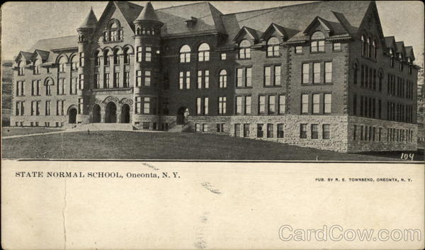 Front: %3| EE 104 STATE NORMAL SCHOOL, Oneonta, N. Y. PUB. BY R, E. TOWNSEND, ONEONTA, N. Y. Back: A.B TUST baku CENT STAMP U. nu. vile PUBLISHED BY R. E. TOWNSEND, 35 BROAD ST., ONEONTA, N. Y.