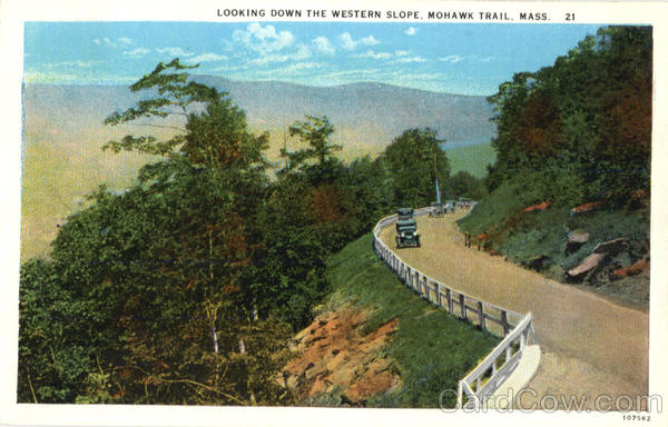 Front: LOOKING DOWN THE WESTERN SLOPE, MOHAWK TRAIL, MASS. 21 107562 Back: PUBLISHED BY C. W. HUGHES & CO., INC., MECHANICVILLE, N. Y. STAR QUALITY T. AMERICAN ART COLORED HERE