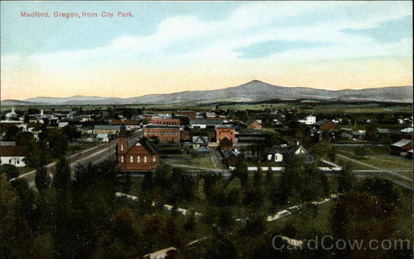 Front: Medford, Oregon, from City Park. Back: Here, ASKA- VUKON-PACIFIC SEATTLE 1709 Cuba 1c 2 c No. 1634 Publ. by Portland Post Card Co. Portland, Ore. and Seattle. Wash , (Made in Germany.) Write here.