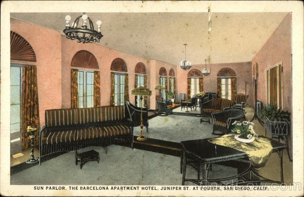 Front: Ca SUN PARLOR, THE BARCELONA APARTMENT HOTEL, JUNIPER ST. AT FOURTH, SAN DIEGO, CALIF. Back: A-10C 594 PUBLISHED BY J. M. SCHEER, SAN DIEGO, CALIF. MADE IN USA-