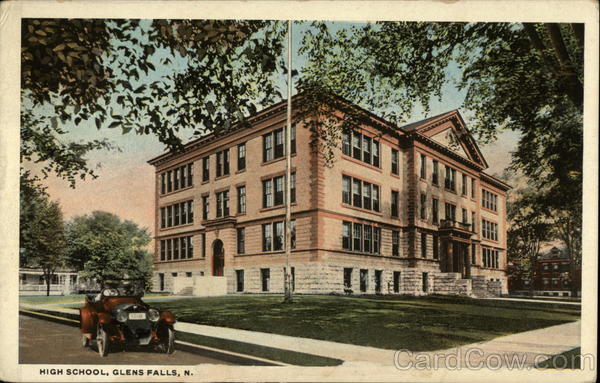 Front: HIGH SCHOOL, GLENS FALLS, N. Back: 35ยข R-72442 STAR QUALITY FOR WRITING MESSAGES ALATEST DOST CARDS C. T AMERICAN ART PUBLISHED BY CHAS. W. HUGHES, MECHANICVILLE, N. Y. MADE IN U. S. A. Mies m. Murphy. 28 Enlid pe Humell CE CO Suches