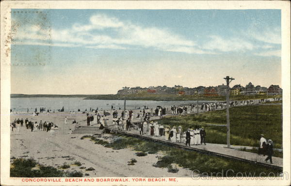 Front: CONCORDVILLE, BEACH AND BOARDWALK, YORK BEACH. ME, Back: WATER STATES ANO CANADA Manufactured by Tichnor Bros., Inc., Boston, Mass. .75