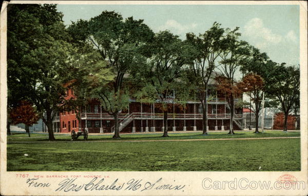Front: 7767 NEW BARRACKS. FORT MONROE. VA COPYRIGH, M6S wris, 1903 BY DETROIT PHOTOGRAPHIC CO Back: and Canada, Foreign. Two Cents.