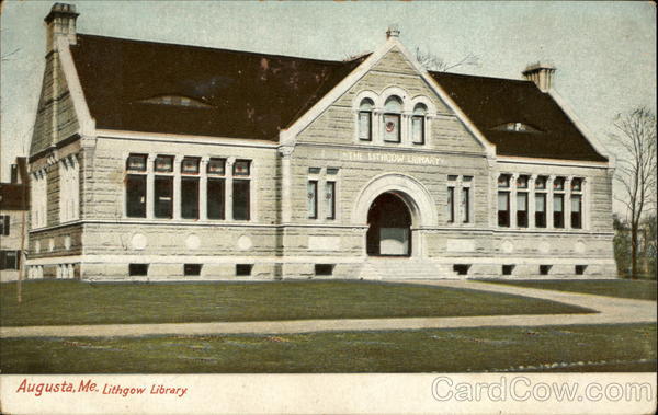 Front: igi + THE LITHCOW EBRARY Augusta, Me. Lithgow Library Back: Beulah ONE OHN | 5 1 PM 1909 MAINT THE HUGH C. LEIGHTON CO., MANUFACTURERS, PORTLAND, ME., U.S.A FRANKFORT %MAIN, GERMANY. N:442 Miss Gertrude Mentworth Warren, Maine, RID. 1. Boy 87