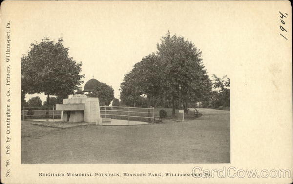 Front: No. 789. Pub. by Cunningham & Co., Printers, Williamsport, Pa. REIGHARD MEMORIAL FOUNTAIN, BRANDON PARK, WILLIAMSPORT, PA. hobl Back: २०० 米米米米 ܗܵܕܸ܀ SIDE FOR THE ADDRESS