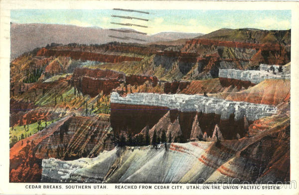 Reached from Cadar City, Utah, On the Union Pacific System. The painted amphitheatres of Southern Utah display Earth's most gorgeous colors. Reached by comfortable motor tours from Cedar City.