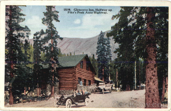 Halfway up Pike's Peak Auto Highway. Glencove Inn was erected about half way up the Pike's Peak Auto Highway. It is for the convenience and comfort of the tourists. Here one can enjoy the finest of cuisine two miles above sea level