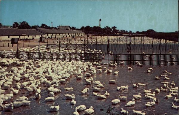 | Noted for their quality, are shipped throughout the world. The breed, White Pekin, represents an annual production of five to six million ducks form the leading duck producing section in the world. Menus everywhere feature the famous Long Island Duckling |