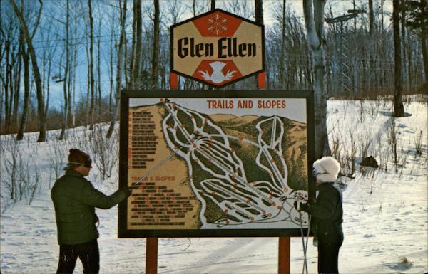| From the challenging FIS Trail to the beginners Snowflake slope, the trail map of Glen Ellen Ski Area illustrates the 32 trails and slopes, three double chairlifts, and poma lift which offer a complete variety of skiing to skiers of all abilities |