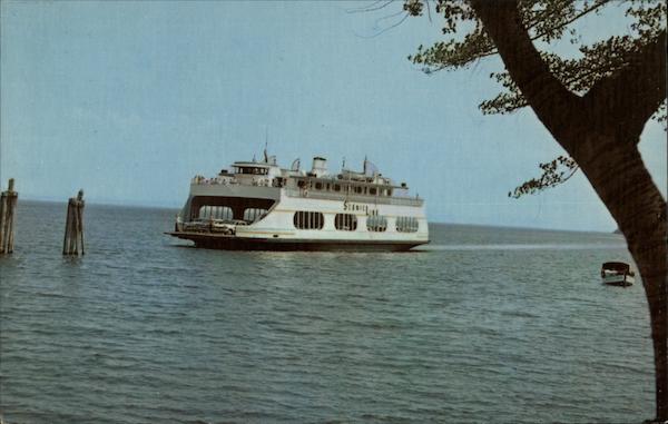 Most beautiful ferry crossing in North America. One of the well appointed and comfortable auto and passenger Scenic Line ferries of the Lake Champlain transportation Co., Inc., between Burlington, Vt., and Port Kent, NY, on Lake Champlain. Refreshments, gifts, and souvenirs are available in the passenger's lounge and deck Mike Roberts |