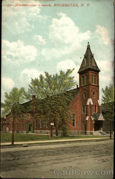 Front: 133-Westminister Church, ROCHESTER, N. Y. FOR SALE Back: Posto ard R || UPMTKE Address.only to be 1909 "Scrantom Wetmore & Co., Publishers Rochester., N. Y." Boul Iris 5 13 Stillow Ave Thacahy