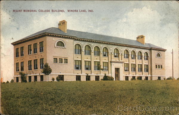 Front: MOUNT MEMORIAL COLLEGE BUILDING, WINONA LAKE, IND. Back: 1916 So IND با این کاربران S 17 PM wa Williende Dora Post Gara Winona terend Ind me Lak Da 9, 1910 naine worried f it will an A Sili And her al Bette fear unitien ne gut Ozu We ar all o
