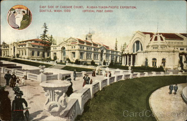 Front: EAST SIDE OF CASCADE COURT, ALASKA-YUKON-PACIFIC EXPOSITION, SEATTLE, WASH. 1909 (OFFICIAL POST CARD) 11 wwww Back: 50 IS. POS- SESSIONS ic MEXICAN 20 Post Gara No. X 147 Portland Post Card Co., Seattle, Washington and Portland, Oregon.