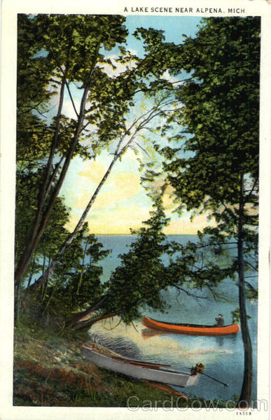 Front: A LAKE SCENE NEAR ALPENA, MICH 14359 Back: PUBLISHED BY ALPENA CANDY & CIGAR CO., ALPENA, MICH. T. AMERICAN ART COLORED 50 12.166 CAGO CLAUDE F. CREEN KALAMAZOO, MICH