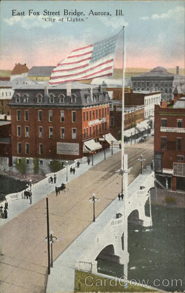 Front: East Fox Street Bridge, Aurora, Ill. "City of Lights." J11 DEA EBO AURORA BUSINESS COLLED OPENS SEPT 7 COBLED A. Back: Со E. C. Kropp Co. Publishers, Milwaukee. Plate 5052
