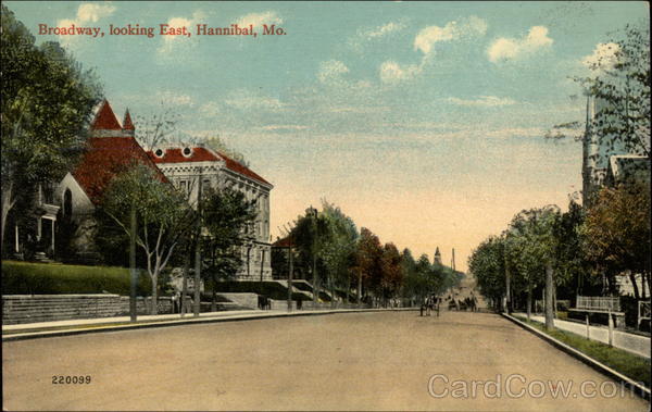 Front: Broadway, looking East, Hannibal, Mo. AM 220099 Back: The Valentine-Souvenir Co., New York. Printed in U. S. A. THROUGHOUT SUPERIOR QUALITY FAMOUS THE WORLD