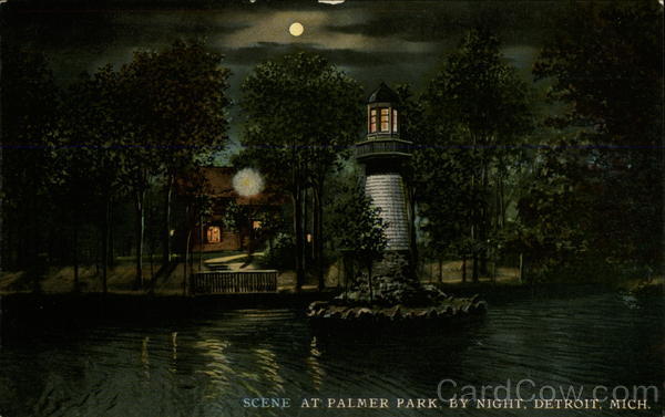 Palmer Park where lighthouse is located is a restful retreat of 120 acres and is located seven miles out Woodward Avenue. One of the delightful features is its log cabin with its quaint furniture. It has many acres of woods, children's playgrounds and a casino where refreshments are served |