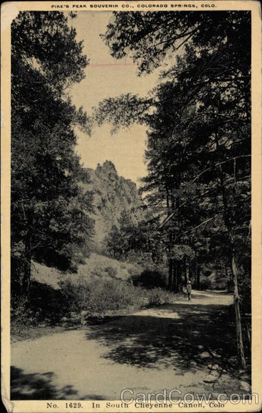 Front: PIKE'S PEAK SOUVENIR Co., COLORADO SPR:NGS, COLO. No. 1629. In South Cheyenne Canon, Colo Back: AFTER MARCH 1, 1907 THIS SPACE CAN BE USED FOR A WRITTEN MESSAGE, USING ONE-CENT STAMP