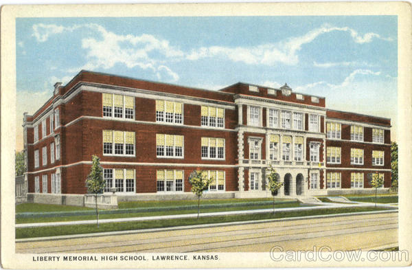 Front: LIBERTY MEMORIAL HIGH SCHOOL, LAWRENCE, KANSAS. Back: A-99324 AND ISLAND POSSESSIONS, CUBA, CANADA AND MEXICO FOR FOREIGN