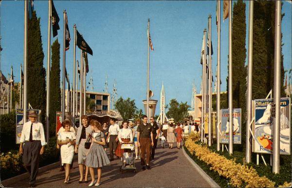 Entrance to Tomorrowland: In Tomorrowland, disneyland's guests are given a preview of the wonderful developments the future holds in store. Here they may actually experience what many of America's foremost men of science and industry predict for the world of tomorrow |