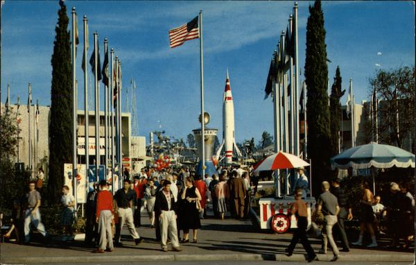 Flags representing each state in the Union flank the entrance to Tomorrowland. Here you experience the future....today. Whisk away into outer space on a trip to the Moon in a rocket ship and enjoy the many other scientific projects of things to come |