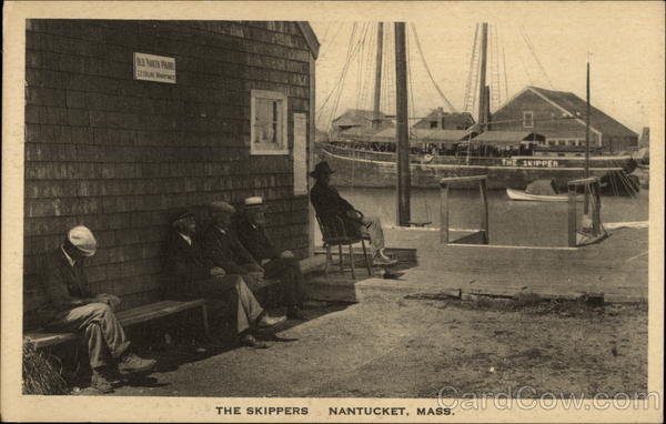 Front: OLD NORTH WRARK CE COLLINS WHARFINGER THE SKIPPER NANTUCKET, MASS. THE SKIPPERS Back: MARSHALL GARDINER, NANTUCKET, MASS. COYPRIGHTED BY H.