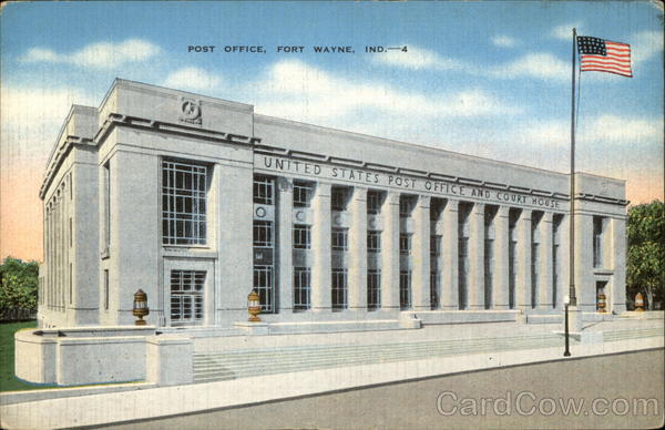 | One of the most beautiful buildings of its kind in the country is the Post Office and Federal Court Building in Fort Wayne. Constructed in 1932 at a cost of more than $1,000,000. The building stone used is Indiana limestone, and the metal fittings and furnishings are aluminum |