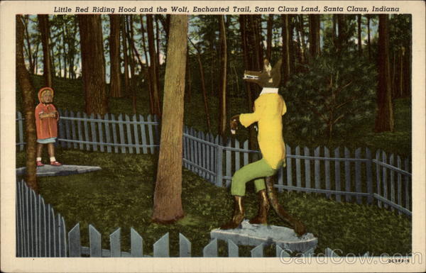 Front: Little Red Riding Hood and the Wolf, Enchanted Trail, Santa Claus Land, Santa Claus, Indiana II OC299-N ** Back: Little Red Riding Hood meets the Big Bad Wolf along the Enchanted Trail in Santa Claus Land. 25