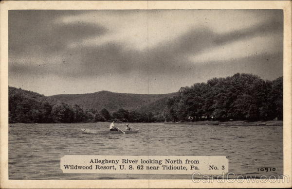 Front: Allegheny River looking North from Wildwood Resort, U. S. 62 near Tidioute, Pa. No. 3 |०१।० Back: Published by Thomas Studio, Jobber, Warren, Pa. august 24, 1945 Silvercraft-Made by The Dexter Press, Pearl River, N. Y.