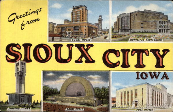 Front: Greetings SIOUX CITY COURT HOUSE MUNICIPAL AUDITORIUM IOWA TTT TTTTTTTTTTTT SINGING TOWER BAND SHELL POST OFFICE Back: fo CO COLOR 23569N Published by Olson News Co., Sioux City, Iowa