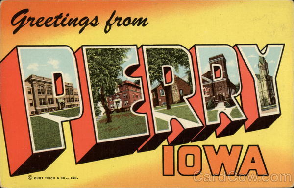 Front: Greetings from IOWA CURT TEICH & CO., INC. Back: Jop P. P-High School E-Kings Daughters Hospital R-American Legion Building R-- Presbyterian Church Y--Catholic Church 9 B336-N DISTRIBUTED BY HAWKEYE NEWS CO., PERRY, TOWA