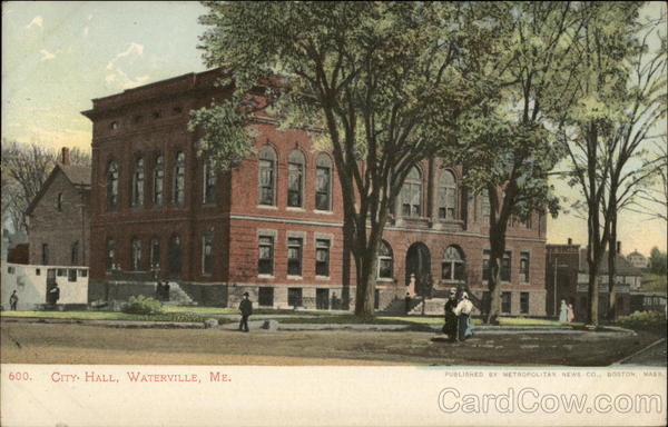 Front: စီကို IC 作 JE 600. CITY. HALL, WATERVILLE, ME. PUBLISHED BY METROPOLITAN NEWS CO., BOSTON, MASS Back: FOREIGN, TWO CENTS. Sacli