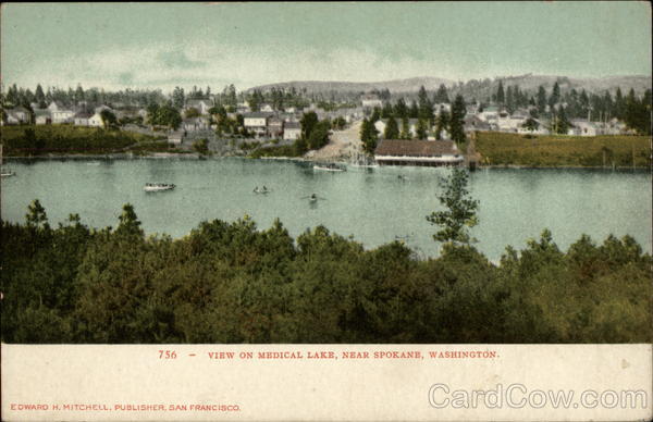 Front: 756 - VIEW ON MEDICAL LAKE, NEAR SPOKANE, WASHINGTON. EDWARD H. MITCHELL, PUBLISHER, SAN FRANCISCO, Back: DHP -Post Card-