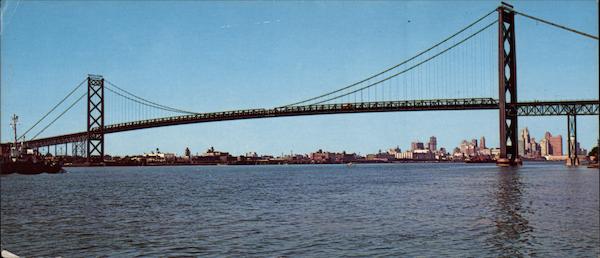 Panoramic View of the Ambassador Bridge with the skyline of Detroit in the background.