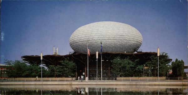 Above the canopy of a forest of steel trees rises the 90-foot-high ovoid theatre of the IBM Pavilion
