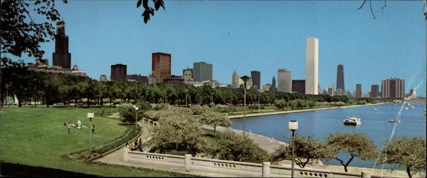 Joboul CHICAGO, ILLINOIS View of Chicago's impressive, new skyline as seen from the Shedd Aquarium. AERO DISTRIBUTING CO. EVANSTON, ILL. CURTEICH COLORⓇ 3-D NATURAL COLOR REPRODUCTIONS (REG.U.S.A. PAT.OFF.) Panoramic P-47 (LETTER POSTAGE) D-19441