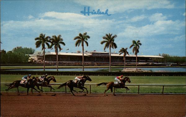 Front: Hialeah A* * * Back: G.514-GULF STREAM CARD & DISTRIBUTING CO., MIAMI, FLORIDA MIAMI, FLORIDA A THRILLING RACE AT HIALEAH RACECOURSE CURTEICHCOLOR® 3-D NATURAL COLOR REPRODUCTION (REG. U.S.A. PAT. OFF.) 9C-K1758