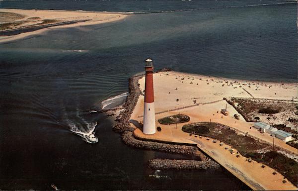 Located in Barnegat Lighthouse State Park, this aerial view shows the entrance to Barnegat Bay at which stands America's second oldest lighthouse, Barnegat, which was built in 1856-58 by Lt. General George Meade. In the background is the Atlantic Ocean