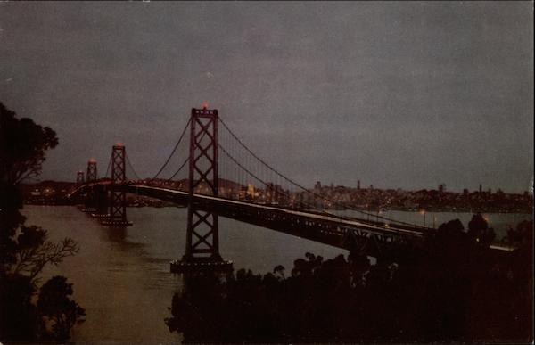 San Francisco-Oakland Bay Bridge spans the largest navigable body of water yet bridged. Total length including approaches is 8 1/4 miles. It is double-decked with six lanes for automobile traffic on upper deck, three for trucks and busses and two interurban tracks on lower deck. At night it is like a fairyland sky ride |