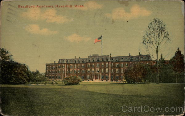 Front: Bradford Academy, Haverhill Mass. T Back: SHILL AR 27 3-30P 11 MASS ** Rost ost Card ONE CENTA John Hanson Switter bigas Store 18udson Mass he was to tired and could not