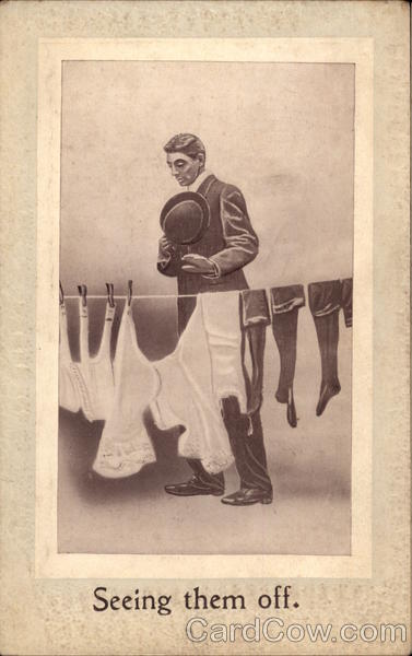 Front: Seeing them off. Back: PLACE POSTAS STAMPERE 00 000 POR CORRESPONDENCE ONLY ODOOD DOMESTI ONE CEN