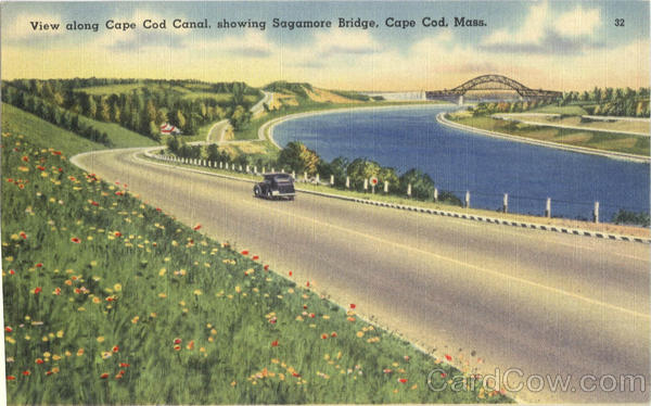 Front: 32 View along Cape Cod Canal, showing Sagamore Bridge. Cape Cod, Mass. Back: MADE IN U, S. A TICHNOR QUALITY VIEWS REG. U.S. PAT, OFF. MADE ONLY BY TICHNOR BROS. INC., BOSTON, KASS. 68223 PUB. BY H. L. MOORE CO., WEST YARMOUTH, MASS.