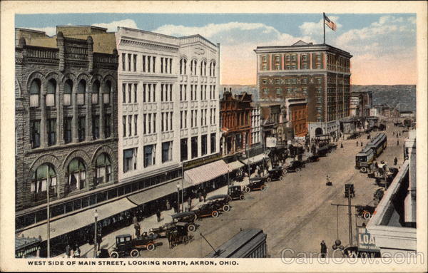 Front: II EENEENE X三 TETEE IIII HEUM LOAT HoREY LOAHE WEST SIDE OF MAIN STREET, LOOKING NORTH, AKRON, OHIO. Back: A-53600 229 MADE IN U. S. A DOST PUBLISHED BY L. SCHARTENBERG & CO, AKRON, OHIO. Nazwa 1 ART 178
