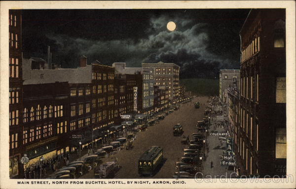 Front: ARCADE COLEMANS DENH KEW YORK GENTISTS HofC IBraul LIZA CHI MAIN STREET, NORTH FROM BUCHTEL HOTEL, BY NIGHT, AKRON, OHIO. Back: A-64705 PUBLISHED BY L. SCHARTENBERG & CO., AKRON, OHIO C. T. AMERICAN ART CE Siege
