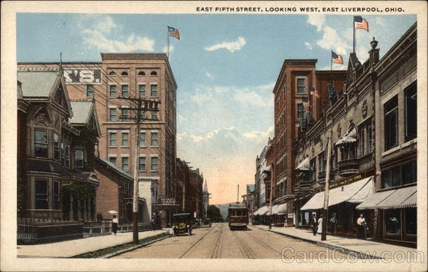 Front: EAST FIFTH STREET, LOOKING WEST, EAST LIVERPOOL, OHIO. I'S. NEE EE ONTH ER SARD 30 LENT STORE SUR FRITZ CIGARS Back: R-42268 FOR WRITING MESSAGES. PITTSBURGH PA MADE IN US. A Randson PUBLISHED BY I. ROBBINS & SON, PITTSBURGH PA,