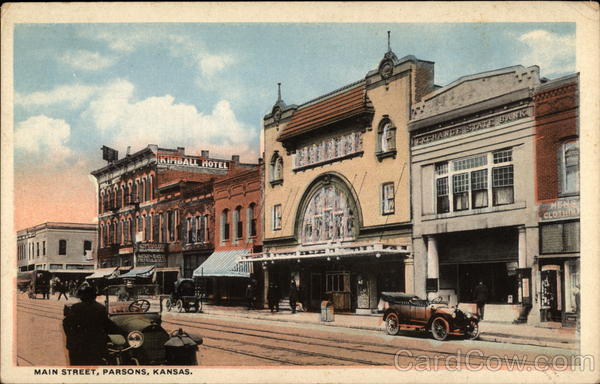 Front: KIMBALL HOTEL EXCHANGE STATE BANK MENS CLOTHIN STAR MAIN STREET, PARSONS, KANSAS. Back: A-57677 C. T AMERICAN 18